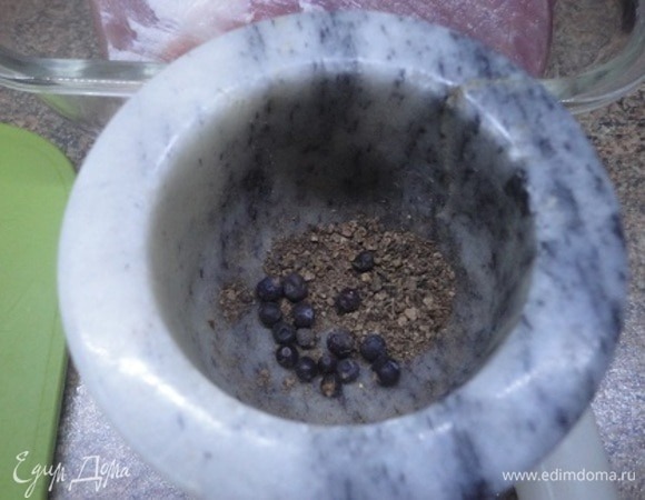 соль - 2ч. л. Все пряности растереть в ступке. Сухие пряности в отдельной посуде смешать с остальными ингредиентами для маринада. Свинину помыть, обсушить бумажным полотенцем и натереть полученной смесью мясо. Оставить мясо в холодильнике на ночь. Можно несколько раз перевернуть мясо, так как маринад стекает на дно посуды. За 30 минут до приготовления достаньте мясо из холодильника, чтобы температура свинины немного приблизилась к комнатной. Если желаете, обвяжите мясо кулинарной нитью или силиконовыми жгутами, чтобы оно лучше держало форму. Разогрейте духовку до 200°C.