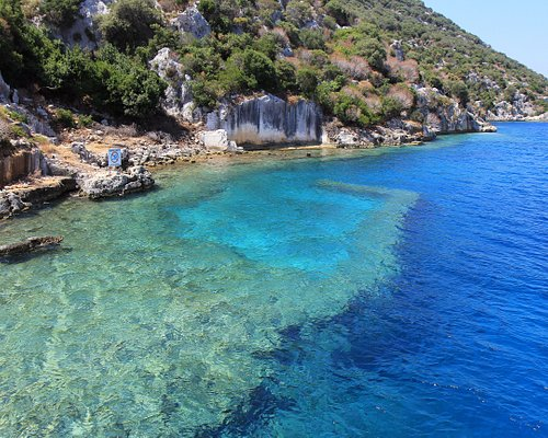 - Кекова. Это небольшой остров, расположенный недалеко от Демре. Здесь гармонично сочетаются кристально чистые воды, уютные песчаные пляжи и древняя история. Дело в том, что на острове находятся руины затонувшего античного города Долчиште. Он был полностью уничтожен землетрясением, произошедшим во 2 веке. Но после этого поселок был восстановлен и еще долгое время служил важными портом для византийцев, пока его не захватили и сожгли арабы. Приехав на остров, первым делом отправляйтесь на его северную часть. Здесь остались фундаменты и элементы стен сооружений, принадлежавших Ликии и Византии. В округе много сальных гробниц, а если спустится на дно с аквалангом, то можно увидеть целый склад затонувших амфор.