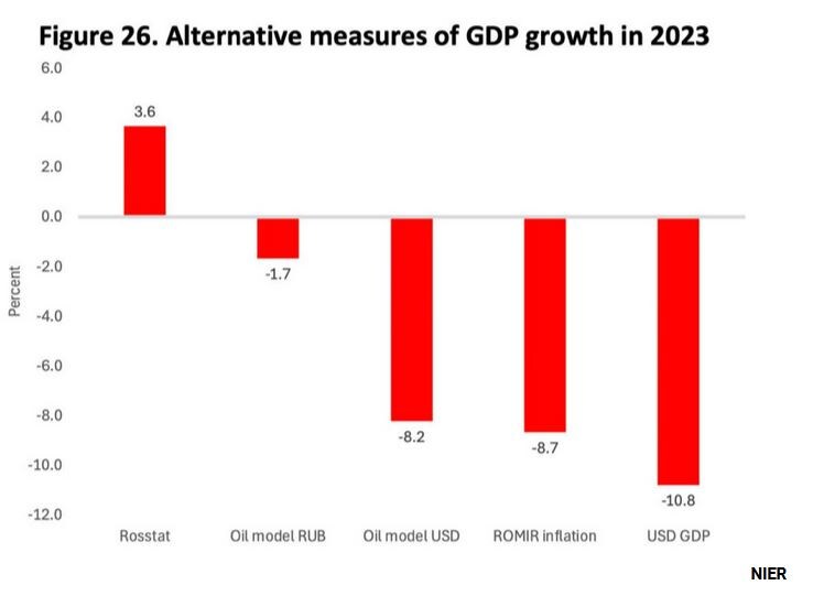 Увидеть очевидное. И, главное, поверить Стокгольмский институт экономики переходного периода при Стокгольмской школе экономики (NIER) по заказу шведского правительства подготовил доклад, в котором обвинил Россию в масштабном экономическом фейке. (Изложение основных идей доклада можно почитать здесь) Инфляция систематически занижается, что автоматически завышает рост ВВП. И далее на 4 моделях проанализировал рост ВВП России в 2023 году. По Росстату, после падения в 2022 на 1,2%, ВВП вырос в 2023 на 3,6%. А фактически роста никакого не было. Спад оценивается от -1,7% до -10,8%. 4 оценки NIER показаны на картинке. Очень осторожно точку зрения шведских экономистов поддержал Сергей Гуриев, ныне — декан Лондонской школы бизнеса. *** Нам остается только порадоваться, что то, о чем мы в этом канале говорим уже второй год под, объявлено громко. Осталось дождаться, чтобы МВФ и Мировой Банк приняли соответствующие корректировки к российской экономический статистике и перестали воспринимать присыл