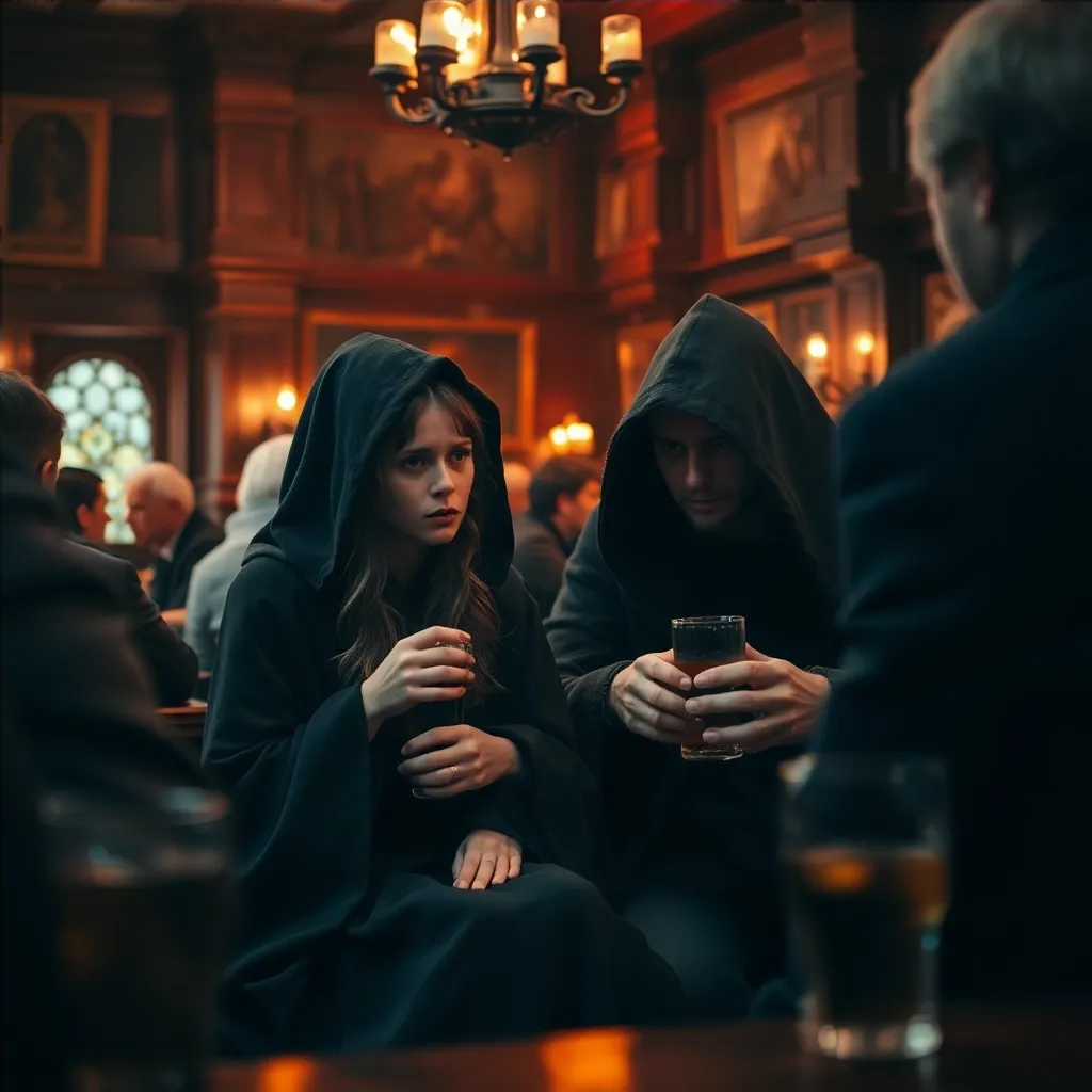 В разгар вечера было шумно. Волшебники, укутавшись в мантии, отогревались, придя с улиц, где ударил первый морозец. Несколько работяг шумно обсуждали, что будет с профсоюзом, успевая осушать свои бокалы с элем. Две ведьмы у стойки сплетничали о некой мадам Флуа и её безвкусных мантиях. Мы сели за дальний столик в углу, пожалуй, единственный незанятый, и заказали себе по пинте вина.