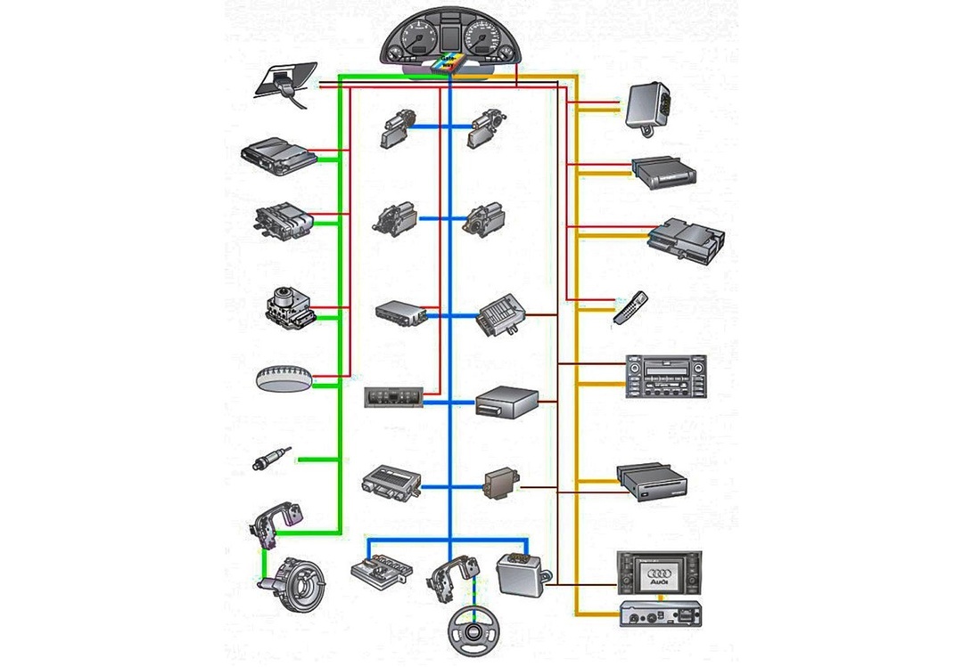 Кроме двигателя компьютеры могут управлять многими другими вещами в автомобиле. Например, дворниками, в многих машинах сейчас мотор дворников управляется мозгами, это решает несколько задач. Более гибкое управление, дворники могут остановиться, если машина стоит на светофоре, и начать работать, если она поедет. Ещё это снижает толщину и длину проводки. Благодаря этому даже в недорогих машинах, сейчас есть очень интересные и полезные функции. Или сиденье. Было бы круто, если бы сиденье чуть отъезжало назад, когда вы открываете дверь, и подъезжало, когда вы сели за руль и включили зажигание. Такие чудеса возможны, и они давно есть в некоторых машинах. Но чтобы это всё работало, дворники должны знать скорость вращения колёс, а сиденье должно видеть открытую дверь. А что если у колёс будет свой компьютер, у дворников свой, а у двери свой, и все они будут обмениваться информацией по внутреннему интернету? Так и есть, это называется CAN шина. Все электронные блоки обмениваются данными между