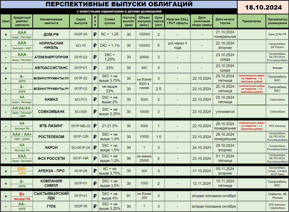 🍷 Добрейшего вечера, дорогие читатели! Пятничный вестник всегда особенный - ведь он ближе всех пяти коллег по неделе к выходным. А это дело я люблю, поскольку без хорошего отдыха и труд не задастся. По мелочи пробежимся по сегодняшним новостям, а там и останется только таблички обновить, которые порадуют приятными дополнениями :) ---------- 🆕 НОВЫЕ РАЗМЕЩЕНИЯ / АНОНСЫ: 🍁 Раздел сегодня поддерживают абсолютно нерыночные, на первый взгляд анонсы. Начну с эмитента АРЕНЗА - ПРО (🅱️🅱️🅱️➖), который верит как минимум в розовых пони, а как максимум в бесконечные деньги АФК СИСТЕМЫ. Итак, выпуск 001Р-06 представлен публике, а в нем: 300 миллионов рублей, ежемесячные выплаты, 3 года обращения и купонный ориентир КС + не выше 3.75%. Нет, никого не смущает, что эмитенты рейтинга 🅰️ предлагают порой значения повыше, а переоцененные стаканы компании стали оцениваться рыночно. Но, ни пуха, что могу сказать. Сбор заявок - 31 октября, старт торгов - 5 ноября. Выпуск только для квалов. 🍁 Фи