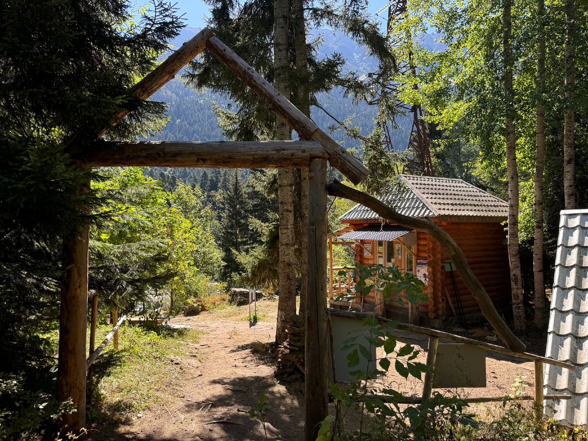 Сначала на машине до указателя на трассе, слева. После съезда по грунтовой дороге пару минут до речки, около которой оборудована небольшая парковка. Мы приехали без чего-то десять, и машины уже занимали четверть мест. Алеша придирчиво оглядывал пейзаж: где тут тень для Генри? Тень была за горами, а на парковку падало открытое солнце и собиралось жарить машины весь день. У въезда примостилась небольшая сувенирная лавка, рядом с ней продавщица раздувала самовар, раскладывала на небольшом столике какие-то шоколадки и хычины для туристов.