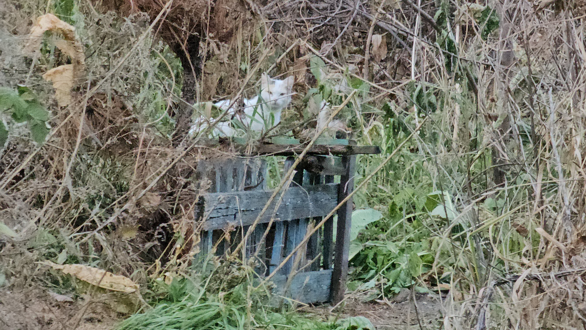 Тогда мы стали её кормить на заброшенном участке, там было где ей укрыться. На том участке высокая трава и заросли. Кошка легко пряталась в поваленном сарае или в кустах.