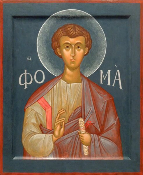 Святой апостол Фома был родом из галилейского города Панеады и занимался рыболовством. Услышав благовестие Иисуса Христа, он всё оставил и последовал за Ним. Апостол Фома входит в число Двоенадесятицы святых апостолов, 12 учеников Спасителя. По свидетельству Священного Писания, святой апостол не поверил рассказам других учеников о Воскресении Иисуса Христа: "Аще не вижу на руку Его язвы гвоздинныя, и вложу перста моего в язвы гвоздинныя, и вложу руку мою в ребра Его, не иму веры" На восьмой день после Воскресения Господь явился апостолу Фоме и показал Свои раны. "Господь мой и Бог мой!" – воскликнул святой апостол. "Фома, бывший некогда слабее других апостолов в вере, сделался по благодати Божией мужественнее, ревностнее и неутомимее всех их, так что обошел со своей проповедью почти всю землю, не убоявшись возвещать Слово Божие народам диким" Иоанн Златоуст. По Церковному Преданию, святой апостол Фома основал христианские Церкви в Палестине, Месопотамии, Парфии, Эфиопии и Индии. Пропо