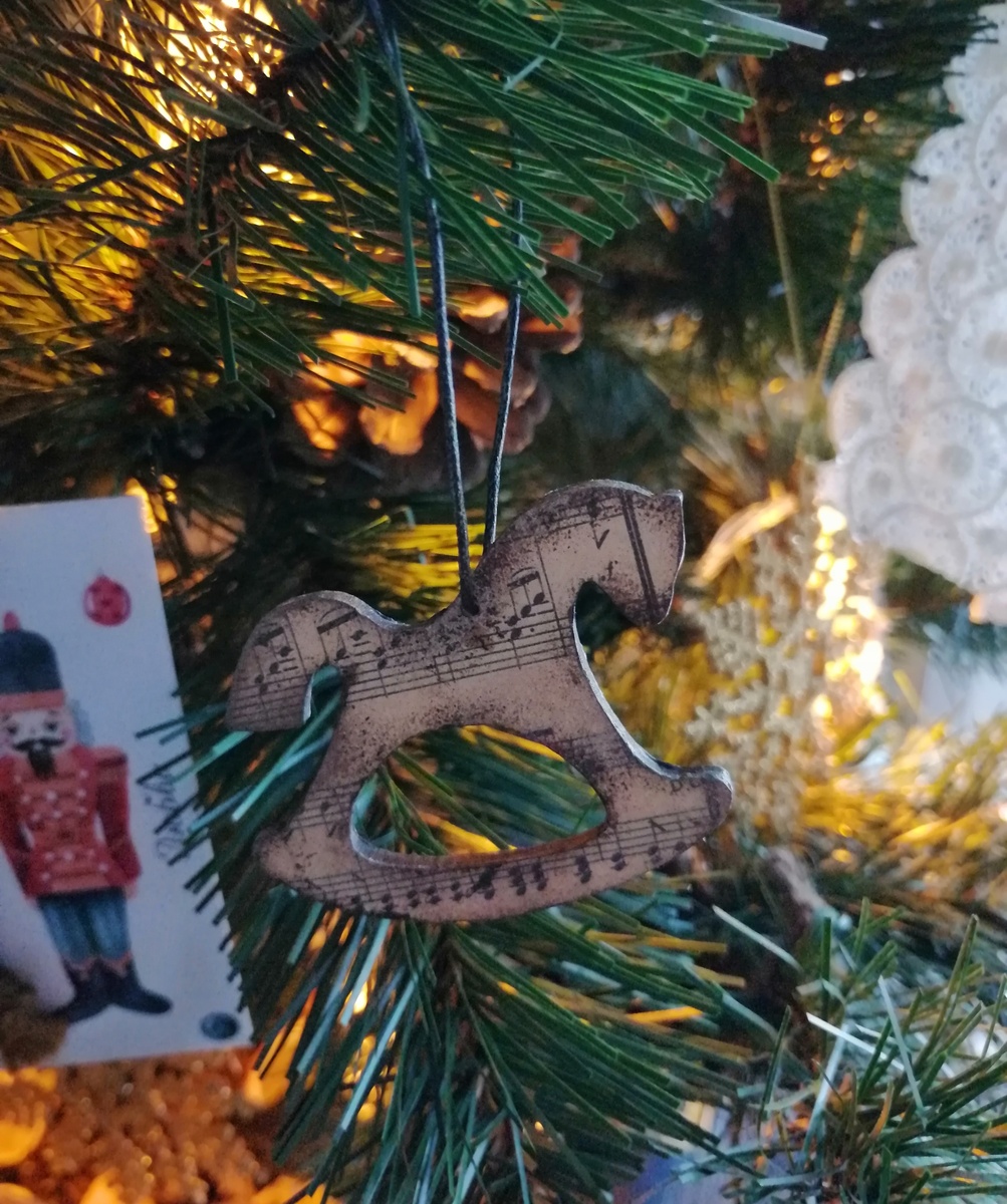 На фото ниже мои лошадки, их не красила. Я наклеила на фанерную основу бумагу с нотами и для более мягкого состаренного эффекта немного припудрила акриловой краской с помощью губки ⬇️