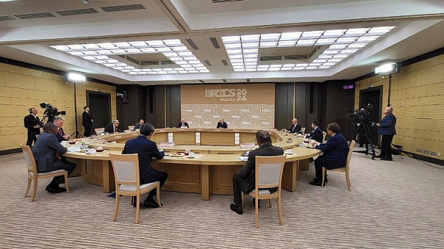 В преддверии саммита БРИКС в Казани, который пройдет 22-24 октября, президент России Владимир Путин провел встречу с руководителями ведущих СМИ стран объединения, а именно: Бразилии, России, Египта, Индии, Китая, ОАЭ, Саудовской Аравии, Эфиопии и ЮАР. Свои вопросы главе государства задали представители партнеров медиасети TV BRICS, в том числе заместитель главного редактора China Media Group и главный редактор CGTN Фань Юнь, исполнительный председатель и основатель Independent Media South Africa Икбаль Мохаммед Сурве, исполнительный директор Fana Broadcasting Corporate (FBC) Адмасу Дамтью Белете, а также журналисты из других СМИ. Встреча организована при участии ведущего российского информагентства МИА «Россия сегодня». Модератором выступил генеральный директор компании, телеведущий Дмитрий Киселев. XVI саммит БРИКС станет ключевым событием российского председательства в объединении. Ожидается, что в мероприятии примут участие представители более 30 стран Азии, Африки и Латинской Амери