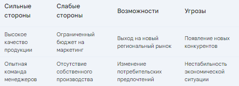 - Strengths (Сильные стороны) — внутренние качества компании, которые дают ей преимущество над конкурентами.