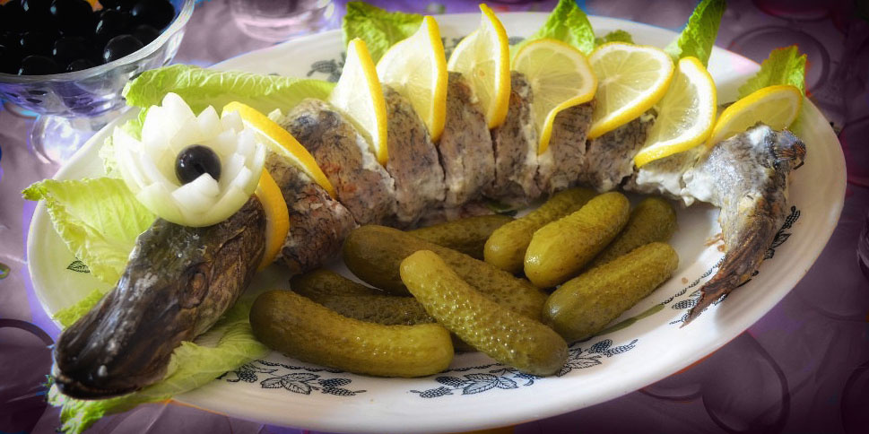 Щука по этому рецепту получается очень вкусной. Ингредиенты : -щука -сало -150гр. -батон -молоко -сметана -соль,перец по вкусу лимон 1.Свежую щуку почистить, не повредив кожу. Вырезать жабры. Голову отрезать. Острым ножом подрезать кожу по окружности (со стороны головы). Освободившуюся кожу вывернуть в направлении к хвосту»чулком». Для большей сохранности кожи подрезание лучше производить так, чтобы на коже оставался небольшой (1~2мм) слой мяса. Плавники вырезать не нужно. 2.Так, постепенно подрезая и выворачивая кожу, дойти до хвоста. Кость у хвоста отрезать, чтобы хвостовой плавник остался с кожей. Из очищенной тушки вынуть внутренности. Ломтики батона замочить в молоке. Мясо с хлебом и салом пропустить через мясорубку. 3.Фарш посолить и поперчить. Кожу заполнить фаршем. Заполнять не очень туго, иначе при запекании кожа лопнет. Тушку зашить. 4.На фольгу положить фаршированную щуку. Голову положить к туловищу. Сверху щуку слегка посолить . Стороны фольги соединить до