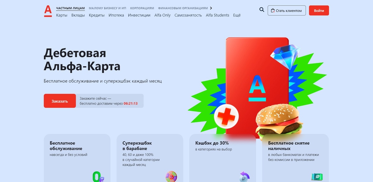 В этой статье всё, практически, тоже самое. 1. Вы не должны быть клиентом Альфа-Банка. 500 рублей получают только новые клиенты 2. Вы должны оформить карту "Альфа-Карта" на сайте банка (ссылка будет ниже). Это включает в себя заполнение всех необходимых данных, подтверждение личности и активацию карты. Карта бесплатная 3. Вы должны совершить первую транзакцию по карте Перейдём к действиям 1. Переходим по ссылке: https://alfa.me/IByzgJ (ОБЯЗАТЕЛЬНО ПО ЭТОЙ ССЫЛКЕ. Если этого не сделать, 500 рублей вы получить не сможете) 2. Нажимаем кнопку "заказать" Заполняем данные и нажимаем "продолжить" Последнее что вам нужно сделать для подачи заявку на выпуск карты - подтвердить номер телефона Вам придёт смс о готовности карты и вы с