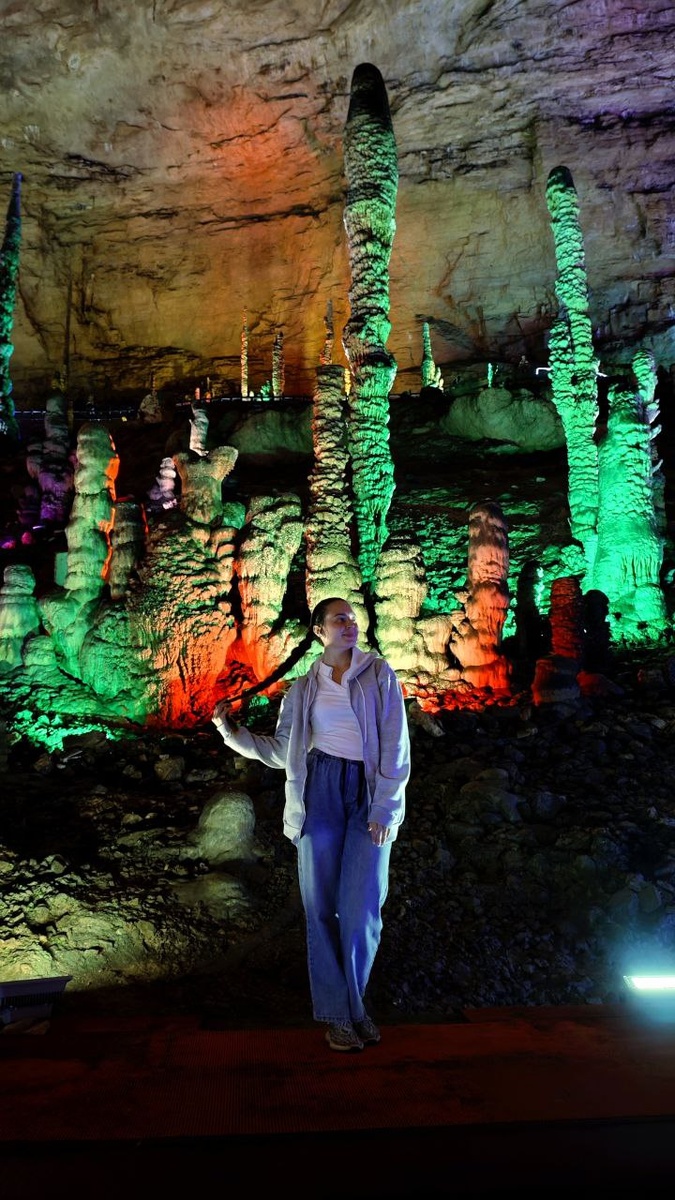 После Фужуна мы как-то подрасслабились и на следующей день полезли не в горы, а под гору – в место, где обитал Желтый Дракон. Ну ладно-ладно, дракона там, конечно, не было, просто так называется пещера – Пещера Желтого Дракона Она находится недалеко от Улиньюань, так что 15 мин на такси, и мы на месте. Вход 120 юаней, и, если честно, я уже привыкла к подобным ценам тут: все же Чжанцзяцзе одно из самых посещаемых мест в Китае, да и вообще в мире. Ну а что вы хотите? Тут посещаемость в 5 раз выше, чем на Гранд-Каньоне в США Начало пещеры – низкий тоннель, подсвеченный всеми цветами радуги. Но потом проход расширяется, и ты попадаешь в огромный зал с мостиками и лестницами. Тут главное маневрировать между тургруппами китайцев и корейцев, которые нещадно терзают твои уши своими громкоговорителями, наплевав на стократное эхо, отраженное от стен В интернете писали, что есть две тропы – тропа долголетия и тропа счастья. Ни той, ни другой мы не нашли, тропа единая и вход тоже один. Но мы