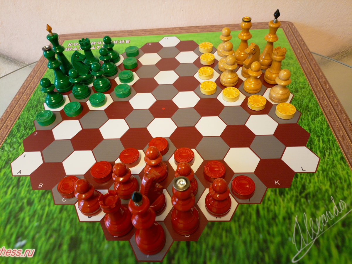 Игры вчетвером производятся только на тетрагональных (квадратных) досках. Игры втроём и вшестером на гексагональных (6-угольных). На тригональных (3-угольных) досках также разработаны многосторонние партии — на троих.