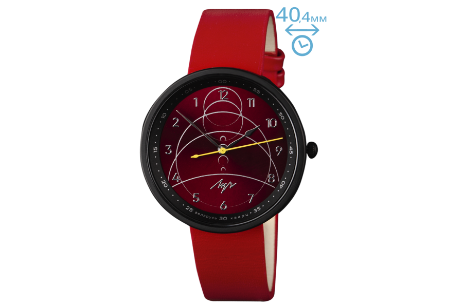 На красном лучеванном циферблате расположились 12 индексов выполненных металлостикером. Цифры идут в обратном порядке, в след за желтой секундной стрелкой. Часовая и минутная стрелки, выполнены в тон цифрам. В районе шести часов, расположился логотип "Луч", так же выполненный металлостикером.
