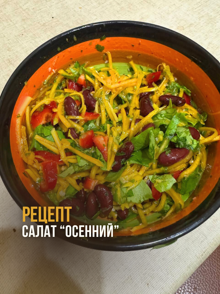 Недавно делала себе такой салат. Рецепт родился спонтанно, а получилось очень вкусно и сытно, поэтому делюсь с тобой. Рецепт: Все смешать, соль не нужна, если берем тыкву по корейски, если берем свежую, то можно посолить по вкусу и добавить черный перец. Салат получается и сочным и сытным одновременно. Очень доступный осенний вариант. И глаз радует, и витаминов достаточно! Вообще, можно менять ингредиенты по своему вкусу, главное, чтобы все сочеталось. Я не рекомендую смешивать больше 3 овощей в одном блюде. Чем меньше мешанины, тем лучше. Зелень не считается) Она везде к месту. А у тебя есть свои интересные рецепты? Делись в комментариях.