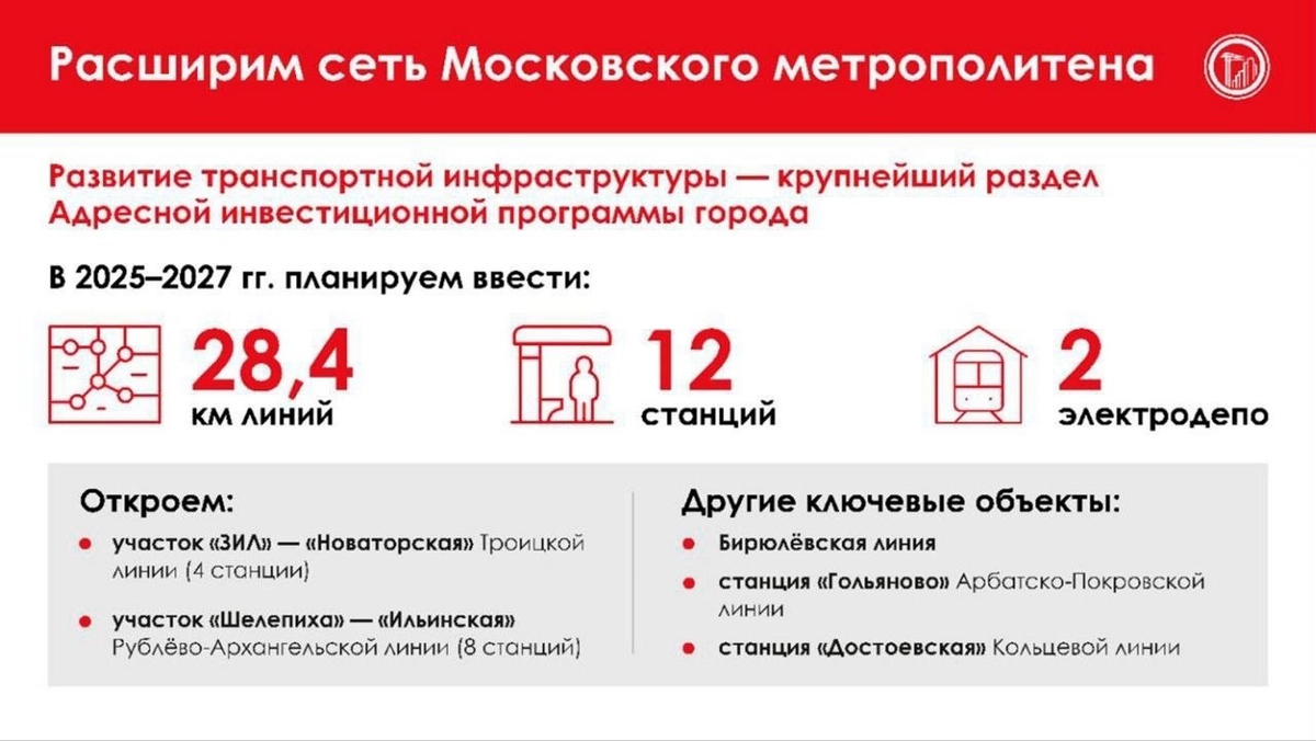 «Деньги на эти цели запланированы. Деньги есть» (с) Опубликована новая АИП (Адресно-Инвестиционная Программа города Москвы) на 2024-2027 годы. По такому случаю - традиционный анализ важного документа от нашего проекта. АИП сохраняет преемственность и приоритеты инвестиционной политики Москвы, определенные в 2011 году. В трехлетний период, с 2025 по 2027 год, планируется построить и ввести в эксплуатацию около 940 различных городских объектов (с учетом строительства домов по программе реновации). В их числе на 2025–2027 годы: Линии метрополитена (километров): 28,4 Станции метрополитена (единиц): 12 Электродепо (единиц): 2 Дороги (километров): 259 Искусственные сооружения (единиц): 45 Пешеходные переходы (единиц): 48 Всего на развитие транспортной системы г. Москвы в 2024-2027 гг. из городского бюджета планируется выделить (в скобках указаны изменения по сравнению с АИП 2023-2026): 2024: 495 млрд. руб. (+ 25 млрд.по сравнению с предыдущей редакцией АИП) 2025: 517 млрд. руб. (+ 58 млрд.
