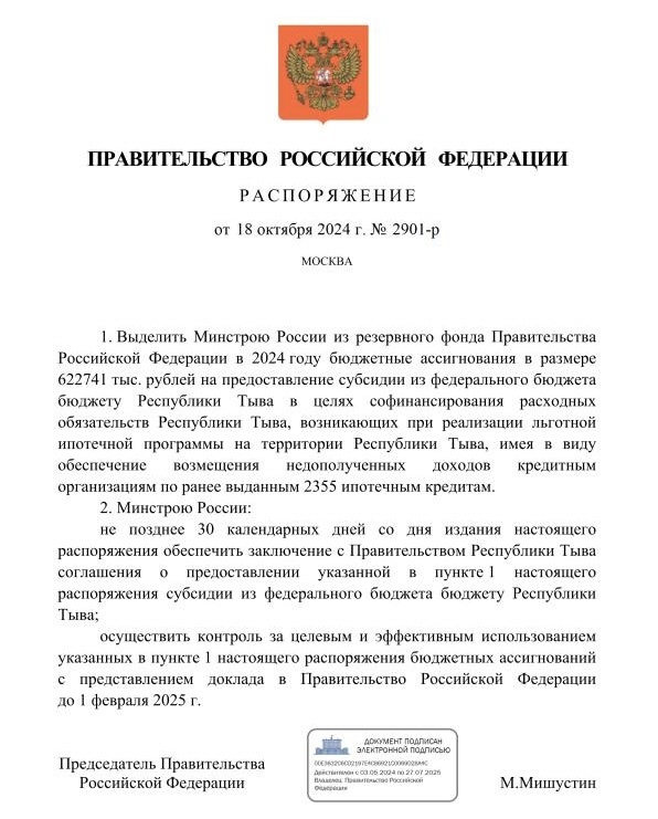 Также Минстрой России в течение 30 дней должен заключить соглашение с правительством Тувы о предоставлении субсидии. Доклад в правительство РФ министерство предоставит до 1 февраля 2025 года. Отметим, что прошло уже около года, как в Туве одобрили программу льготной ипотеки под 2%. На эти цели регион получил в 2023 году из федерального бюджета 250 млн рублей. Программа была рассчитана до июля 2024 года. В сентябре, во время визита в республику президента России Владимира Путина, глава Тувы Владислав Ховалыг попросил продлить программу льготной ипотеки для жителей республики. После этого Путин поручил кабмину изучить возможность особой льготной ипотеки в Туве.