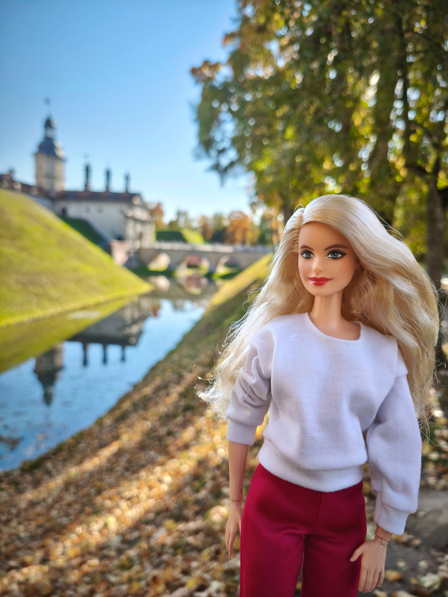На второй день мы съездили в два замка - Несвижский и Мирский, первый находится примерно в 2х часах езды на машине от Минска, а второй в 30 км от первого. Оба замка очень красивые, но по-разному, и сегодня с Милли покажем более парадный и праздничный Несвижский. Для прогулки Милли выбрала малиновые брюки-клеш от Эль 14, и белый джемпер. Погода была теплая и солнечная. Оставив машину на парковке за территорией, мы пошли к замку. Он находится в окружении прямоугольного рва с водой. Перешли по мостику во внутренний двор. И взяли билеты в экспозицию "Дворцовые интерьеры" ("Палацавыя інтэр'еры", если точнее🤭). Они нас удивили! Не могли не сравнивать с Питерскими дворцами, есть отличия - побольше мрака и готики. Хотя и светлые роскошные залы с позолотой тоже есть. Чтобы сильно не утомлять, покажу 7 фото. Этот замок - родовое гнездо богатейшего семейства Радзивиллов, к ним даже польский король заезжать денег одолжить. В войну в замке располагался немецкий госпиталь, отступая, немцы его