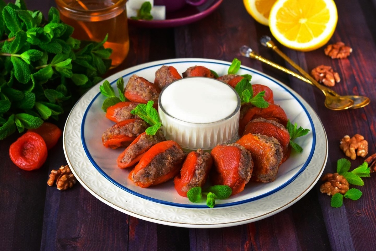 Продолжаю тему сладостей из сухофруктов с орехами. На этот раз рецепт из кураги. 1. Курагу заливаем водой на 1 – 2 часа (если курага свежая и не сухая, то замачивать не надо). 2. Орехи измельчаем в блендере. 3. Соединяем 1 ст. л. мёда, сок лимона и орехи, Перемешиваем до однородного состояния! 4. Курагу фаршируем медово-ореховой массой. 5. В отдельной ёмкости соединяем сметану, мёд и взбиваем всё миксером, до однородного состояния. 6. Наносим соус на фаршированную курагу и ставим лакомство в холодильник на 30 – 40 минут. Понравился рецепт? Пишите в комментариях.
