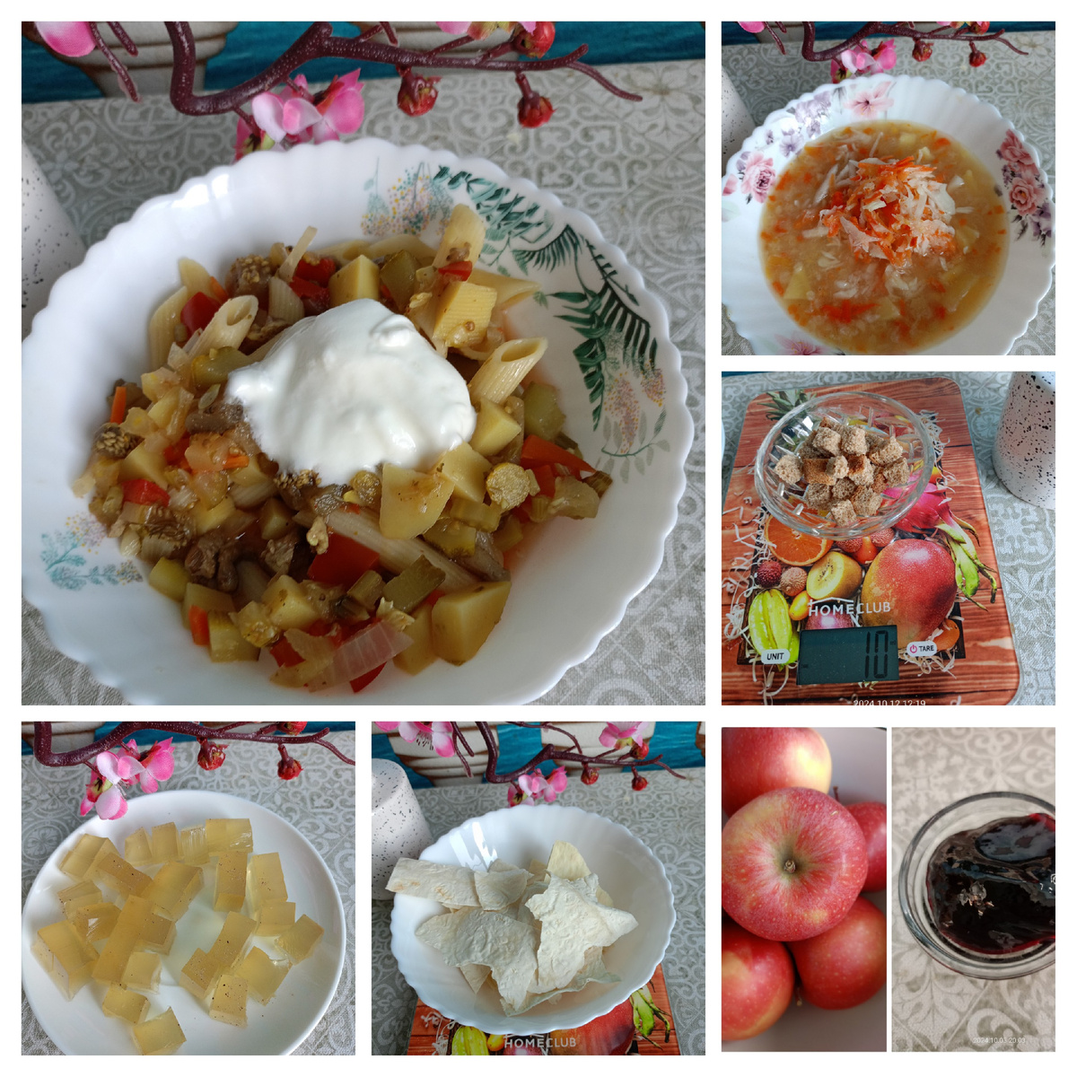 Всем привет! С Вами Татьяна, пенсионерка. Мне 73 года, рост 151 см, вес 56,4 кг ✅ 27.02.23 мой вес был 82 кг. В процессе своего похудения в течение года я сбросила 26 кг лишнего веса. Цель - нормальный вес 53-54 кг для роста 151 см. *** Решила вести дневник питания за неделю, прошедшую после контрольного взвешивания в субботу. Фото и описание питания каждого дня показывают, какие продукты и блюда использовались на этой неделе. Надеюсь, это поможет мне оптимизировать свой вес. Суббота 12.10.24 534 ккал Завтрак - гороховый суп с квашеной капустой и ржаными сухариками. Обед - овощное рагу на говяжьем бульоне с макаронами, заправлено мацони Перекус - желатиновые кубики, чай с повидлом, яблоки, сушёный лаваш *** Воскресенье 13.10.24 660 ккал Завтрак - одно жареное яйцо с тушёными овощами (помидоры, лук, болгарский перец) с отварными макаронами вместо хлеба. Обед - овощное рагу на говяжьем бульоне с макаронами и мацони, квашеная капуста Перекус - желатиновые кубики, чай с пови