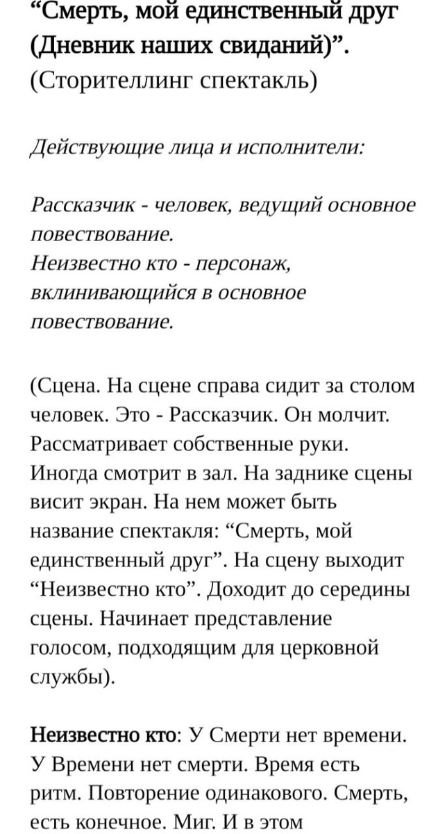 «This is the end… My only friend… The End…» J.D. Morrison Такого я сам от себя не ожидал. За год написано 10 театральных пьес. Начал я в конце прошлого октября с “Я - якут!” (Наднациональная история). Дальше были пьесы о войне, о России, о Волге, о Родословии, об открытии Америки, о Моррисоне и Христе, о Гильгамеше… даже о Колобке. Подходит конец этого октября. Он завершается пьесой о Смерти. Больше десяти лет назад мной была написана книга “Размышления и воспоминания о Смерти”. Теперь я сделал из нее театральную пьесу. Ну, или… если быть совсем точным, сценарий сторителлинг спектакля. Суть очень простая. Как-то я решил описать эпизод, когда в мою жизнь пришла Смерть “весомо и зримо”. Так, что я переживал это пришествие достаточно долго. Думаю у каждого рано или поздно такой эпизод случается. Не всегда он связан со смертью близкого человека. Как, например, у меня. Интересно было другое… Как только я начал вспоминать в подробностях тот эпизод, тут же на бумагу полезли воспоминания о мои