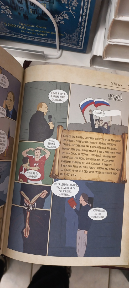Каждый день ходим в "Читай-город". Сережа скупает свои манги. Сегодня на моих глазах женщина приобрела портрет Путина, чему я впечатлилась. Рядом книга автора Шульман с припиской про иноагента. Однако в продаже.... А в киоске "Печать" на моих глазах человек купил "Комсомолку", я думала её уж не покупают, давно в руках не держала... Я Серёже, мол, чем тебя так манги прельщают? Отвечает, что там экшен, кровь, преступления. Я, дескать, "Преступление и наказание" Достоевского ничем не хуже. Он согласился и нашел комиксы "Преступление и наказание". Стоят 3 тысячи! Я обалдела. Там картинки с подписями. В разделе комиксов же история России от древней Руси до Путина - в комиксах. Ельцин изображен с фразой "Я ухожу"... "Крым наш" там же... "Давай комиксы Достоевского", - предложил. Классика в комиксах - нет, я не понимаю прогресса. "Так читать быстрее", - уверен Сережа. Нет, говорю, лучше обыкновенную книжку с текстом. "Но у Достоевского точно триллер?