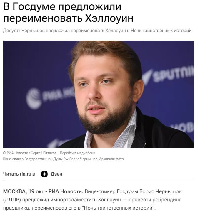 В Госдуме, похоже, наконец-то решили заняться «настоящими» делами — ребрендингом Хэллоуина. Да-да, не повышением пенсий, не борьбой с инфляцией или поддержкой здравоохранения, а заменой «иностранных смыслов» праздника на что-то более «российское». Вице-спикер Борис Чернышов из ЛДПР, которому всего 32 года, предлагает переименовать Хэллоуин в «Ночь таинственных историй», видимо, полагая, что именно это поможет стране и ее жителям. Интересно, знает ли Чернышов, что в глубинке России люди живут на пенсии по 10 тысяч рублей, которых едва хватает на самое необходимое? А еще, что демографическая ситуация в стране — это катастрофа? А как насчет огромных очередей к врачам, когда люди по две недели и больше не могут попасть на прием даже в критических ситуациях? Цены на все, включая ЖКХ, продукты, топливо и другие базовые нужды, постоянно растут, и люди вынуждены пересматривать свои бюджеты, отказываясь от многих необходимых вещей. Почему для Чернышова более важно бороться с «иностранными смысл