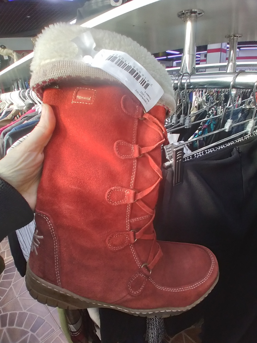 Здравствуйте, обзор из Столичного гардероба. Всё можно было купить со скидкой 80%, цены пишу полные. Обзоры с обувью у меня вообще не имеют просмотров, но мне терять нечего кроме нескольких рублей)). Поэтому обувь в студию! Красные сапожки, внутри густой белый мех, на пяточке вышита снежинка, чтобы кто-нибудь сезон не перепутал)), а шнуровка обеспечит комфортную посадку. Это Тамарис. Полная цена 4500 руб. Ещё одни зимние сапоги и тоже с завязками, похоже на замшу. Внутри мех пожиже, но и цена поменьше. Дальше вся обувь по цене от 3000 и до 3500. Демисезонные сапоги из кожзама. Если эта огромная подошва не лопнет, то сапоги можно назвать демисезонными-всепролазными)). Несмотря на массивный вид они довольно лёгкие. Берцы с цепочками, сбоку есть молния. Мятые, но в очень приличном состоянии, только со стельки название стерлось. Симпатичные челси и выглядят новыми. Синий нубук, каблук хороший да и подошва не тонкая, внутри маленький ворс. И ещё одни всепролазы ( моя бабушка назвала бы их