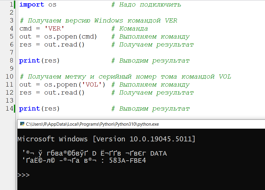 Также вы наверняка обратили внимание, что итог выполнения команды VER выведен читаемо, а вот команда VOL вернула нам кракозябры. Это связано с тем, что в Windows командная строка имеет кодировку CP1251, а Python работает в Юникоде. Команда VER возвращает только английские буквы, поэтому строка выводится правильно. А вот в результате работы команды VOL есть и русские буквы. Поэтому из-за разных кодировок вместо них выводятся кракозябры.