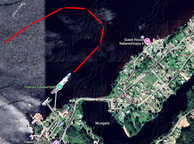 После завершения автобусной экскурсии в Александро-Свирский монастырь, рассказ о которой я закончил в предыдущей статье, мы вернулись к причалу в Свирьстрое, чтобы продолжить плавание вниз по Свири. Нашим теплоходом в круизе 2024 года был четырёхпалубный «Георгий Чичерин» – пришвартован, как и судно на карте выше, носом против течения. Возвращаясь на теплоход, застал, как матросы осматривали место стыка привального бруса с корпусом судна. Мы ещё не отошли от причала, а на смену нам сверху по течению пришёл новый «гость» – теплоход «Лебединое озеро». Четырёхпалубный теплоход «Лебединое озеро» был построен по проекту 302 в городе Бойценбург (ГДР) в 1986 году под именем «Генерал Ватутин». Эксплуатировался на Украине, в 1993 году был переименован в «Генерал Ватутiн». В 2000 году прошёл реконструкцию. В 2017 году под именем «General Vatutin» был продан в Россию. После реконструкции в 2018 году получил название «Лебединое озеро». Мы некоторое время идём от причала вверх по течению, освобожда