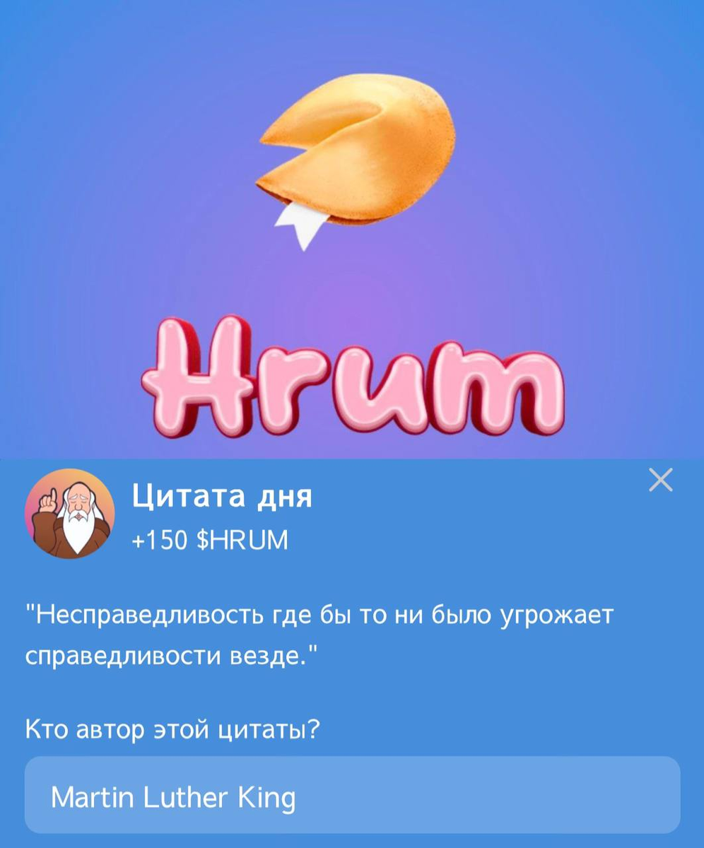 🥠 HRUM Цитата дня от 19.10.24 Ответ: Martin Luther King Заходим, получаем свои печеньки HRUM, хрустим и получаем предсказания на день, Вангую☝️☝️☝️ Будет 👉👉👉 полетим 🚀🚀🚀🚀 Друзья кто пропустил, пожалуйста не пропускайте, это не требует много времени. Меньше минуты. HRUM. Не пропускайте свои 🥠🥠🥠печеньки Hrum 👉👉👉 тут. Зашли в HRUM? Поставь 💓💓💓 и подпишись! Будь в числе первых! Ты же пропустил X Emperi , не пропусти Печенье