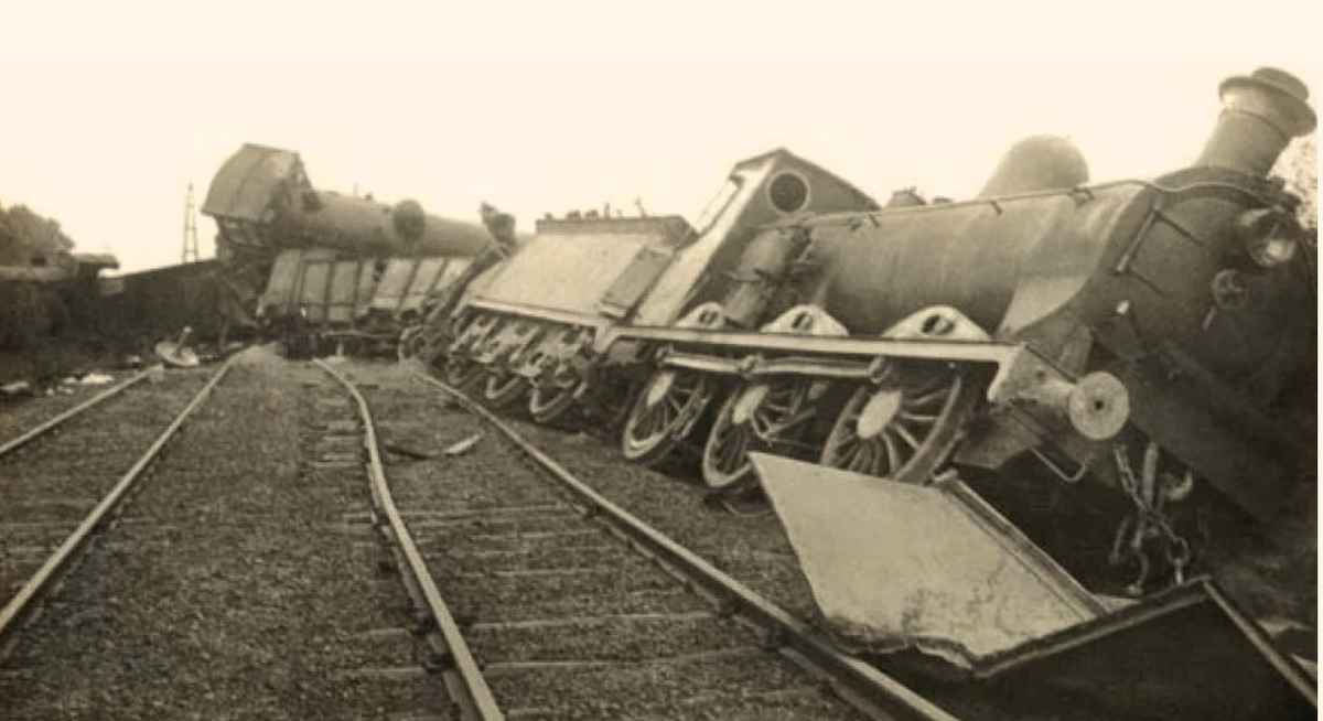 Поезд пройдя несколько метров вперед, остановился. В передние вагоны попали снаряды, вместо рельсов зияла воронка.