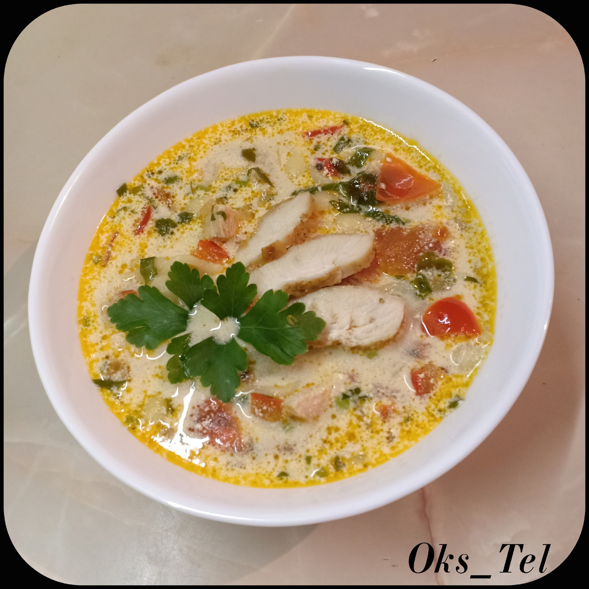 Вкуснейший и ароматнейший сливочный супчик с курицей овощами и обжаренной курочкой отныне навсегда может поселиться в вашей кулинарной книге. Очень вкусно, очень просто и очень душевно. Друзья, обязательно попробуйте этот кулинарный шедевр, который никого не оставит равнодушным. ПОНАДОБИТСЯ: - 1 куриное филе, - 1 сладкий перец, - 2 средних помидора, - 1 головка репчатого лука, - 2 зубчика чеснока, - 200мл сливок, жирностью 20%, - 1,5л воды, - 100г мелких макарон, - петрушка - по вкусу, - приправа для курицы - по вкусу, - паприка сладкая - по вкусу, - масло растительное - по вкусу, - соль, перец - по вкусу. ПРИГОТОВЛЕНИЕ: 1. Куриное филе помыть и разрезать вдоль на 2-3 пласта. Чем тоньше пласт, тем удобнее его будет обжаривать и нарезать в дальнейшем. 2. Каждый пласт с обеих сторон присыпать солью, паприкой и специями для курицы. Капнуть немного растительного масла и равномерно растереть все по поверхности мяса. Оставить мариноваться на 20мин. 3. Лук и перец вымыть, очистить и нарезать