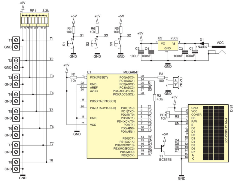Представленный термометр предназначен для контроля температуры в 8 местах с помощью датчиков DS18B20, оснащенных интерфейсом 1-Wire. Мы можем объявить нормальный диапазон температур для каждого датчика, а при его превышении вас проинформирует звуковой сигнал. Диапазон измерения температуры –55...125°С с разрешением 0,1°С. Описание схемы Принципиальная схема термометра представлена на рис. 1. Термометр управляется микроконтроллером (МК) ATmega8, синхронизируемым встроенным RC-генератором. Питание термометра должно осуществляться от постоянного напряжения 7...16 В, подключаемого к разъему VCC. Это может быть любой подключаемый блок питания с нагрузочным током 200 мА. Диод D1 защищает систему от неправильного подключения входного напряжения питания. Стабилизатор U2 выдает +5 В, а конденсаторы С1...С4 обеспечивают соответствующую фильтрацию напряжения питания. Результаты измерений отображаются на ЖК-дисплее с символьной организацией 4 строки и 16 символов. Благодаря этому можно отображать