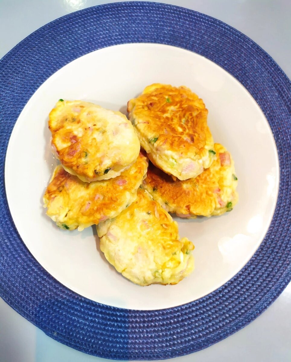 Добрый день! Сегодня для вас ещё одна идея для завтрака: Ленивые пирожки (Или оладьи с начинкой, называйте как вам больше нравится) Кефир 200 мл Мука 150 г Сода пищевая 1/3 ч. л. Яйца куриные сырые 2 шт. Ветчина 100 г Любой твëрдый сыр 50 г лук зеленый 2 стрелки соль 1/2 ч. л. Сахар 1/2 ч. л. Топлёное масло В кефир добавить соду и яйца, соль и сахар, перемешать, добавить половину от объëма муки и замесить тесто. Ветчину нарезать кубиком. Сыр натереть на тëрке. Лук мелко нарезать. Всë смешать и добавить в тесто. Добавить оставшуюся часть муки и перемешать. Получится крутое тесто с начинкой внутри. Тесто выложить ложкой на сковороду с разогретым топлëным маслом, жарить с двух сторон до готовности. Если пирожки получились слишком толстыми, можно обжарить их с двух сторон на сковороде и довести до готовности в духовке - 5 мин при 160С. #завтрак #пирожки