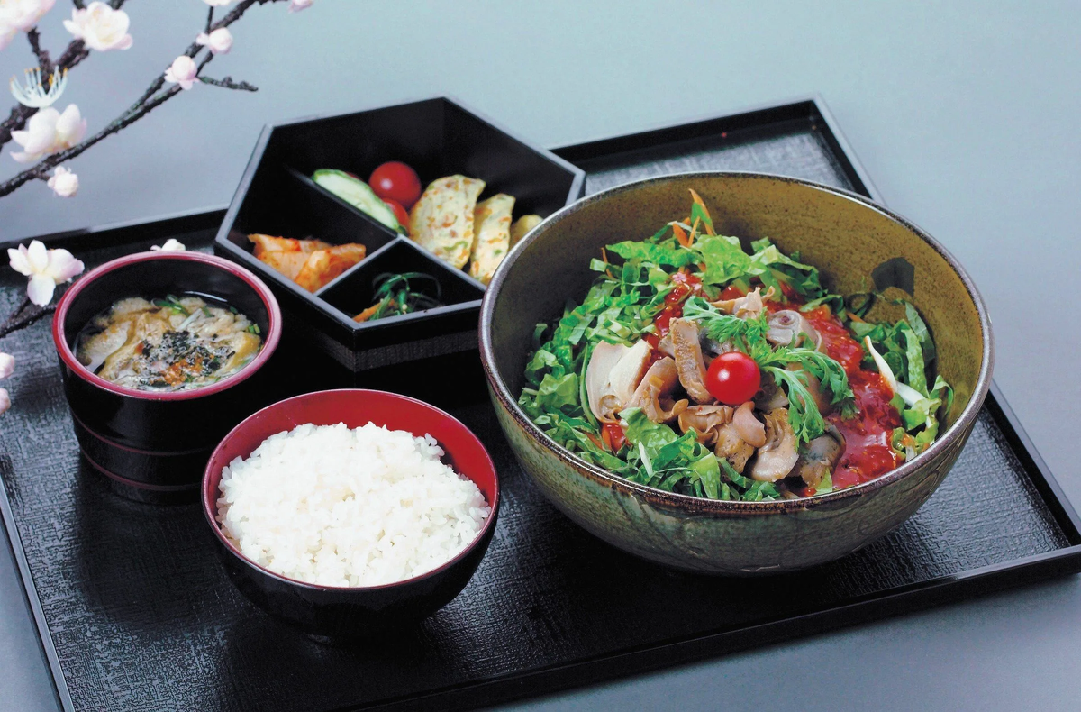 Японские приемы пищи обычно состоят из основного продукта питания в сочетании с супом, основным блюдом и несколькими гарнирами.