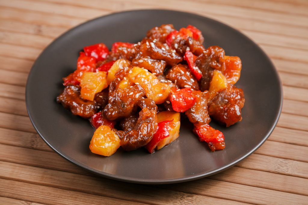 Свинина в кисло-сладком соусе со сладким перцем и луком