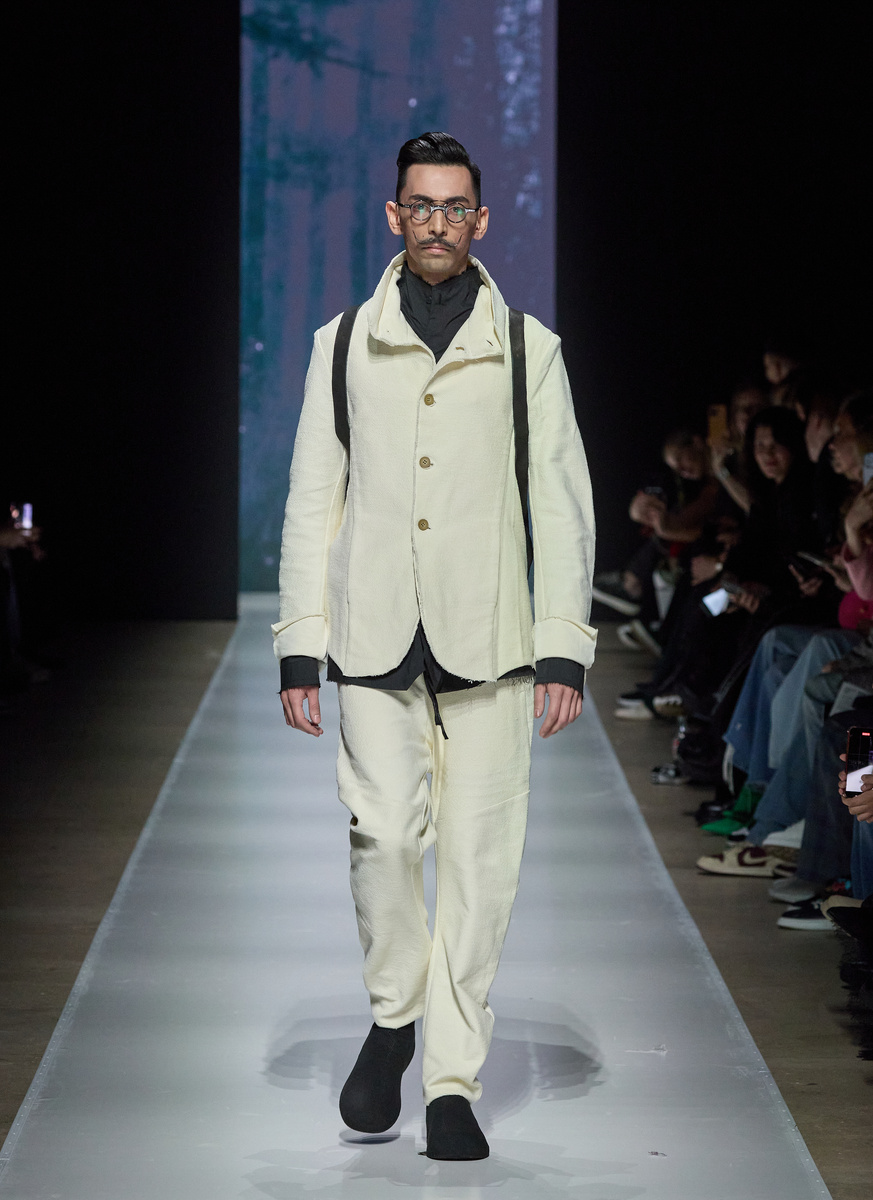 Бренд Ermi провел показ, полностью передающий его ДНК: целью коллекции было создание подлинной архитектурной проекции. Команда Ermi при создании коллекции посвятила много времени изучению архивных эскизов и старинных костюмов XVIII–XX веков, выявляя ключевые детали. Например, в новой коллекции было представлено много «вареного» денима, узоры которого выделялись легкими потертостями — такой прием необходим, чтобы визуально отправить нас в прошлое. Также мы увидели приталенные жакеты, которые украшали акцентные пуговицы, асимметричные высокие вороты и гибридные вставки из разных материалов.