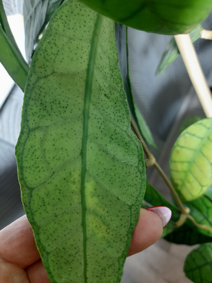 Столкнулась недавно с ситуацией при продаже хойи, когда покупательница в ужасе утверждала, что приобретенный у меня черенок хойи заражён паутинным клещом. Пытаясь ей объяснить, что растение абсолютно здорово и никакого клеща там нет, я поняла, что довольно многие люди ещё "не в теме" и решила написать об этом. Многие новички, а также те, у кого в наличии имеется не так много хой, часто пугаются, видя на свежеприобретенных (да и на уже имеющихся) вот такое явление: Действительно, зрелище ещё то, когда сталкиваешься с ним впервые. Первая реакция: "Боже, что с моим растением и кто его жрёт???!" Действительно, черные точки на обратной стороне похожи на результат деятельности паутинного клеща. А некоторые даже умудряются видеть здесь грибок, хотя грибковые поражения выглядят иначе. В общем, кому на что фантазии хватит, то и подозревают. И начинают изо всех сил "спасать" свое бедное растение, обрабатывая от всех немыслимых врагов всякой химией, какая под рукой имеется. Не стоит этого д
