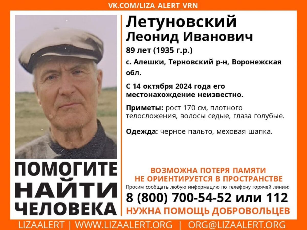 Волонтеры ищут пропавшего без вести 89-летнего Леонида Летуновского. Мужчина пропал 14 октября в селе Алешки Терновского района Воронежской области. Поиски пропавшего начались вчера, 19 октября. Сегодня волонтеры осуществили еще один выезд. Ориентировку распространили в поисковом отряде "Лиза Алерт". У пенсионера плотное телосложение, голубые глаза и седые волосы. Рост Леонида составляет 170 сантиметров. Он был одет в черное пальто и меховую шапку. Отмечается, что пенсионер не ориентируется в пространстве и мог потерять память. Всех, кто может знать что-то о месте нахождения Леонида, просят обращаться по номерам в ориентировке.
