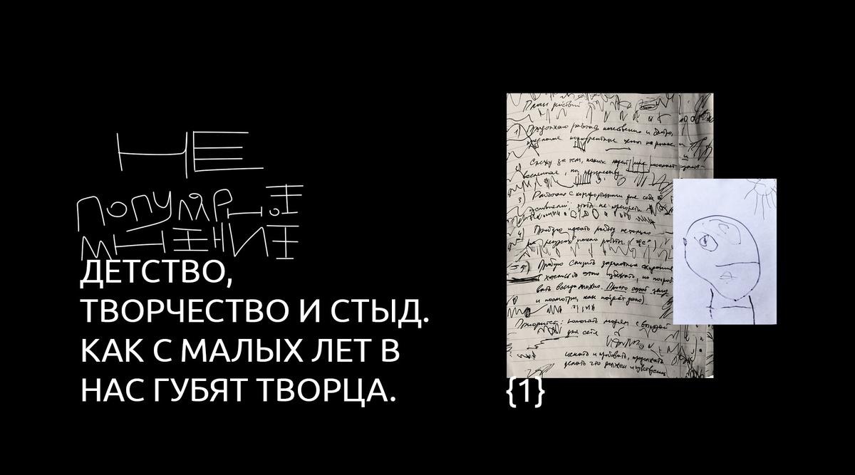 Возвращаясь к воспитанию ребенка и к тому, через что мы сами проходили с вами в детстве, не могу не затронуть тему творческого процесса, через который проходит каждый. И здесь я хотел бы рассказать три истории. Первая будет о классическом воспитании, вторая — о моем пути становления, третья — про мою шестилетнюю дочку и ее трансформации.