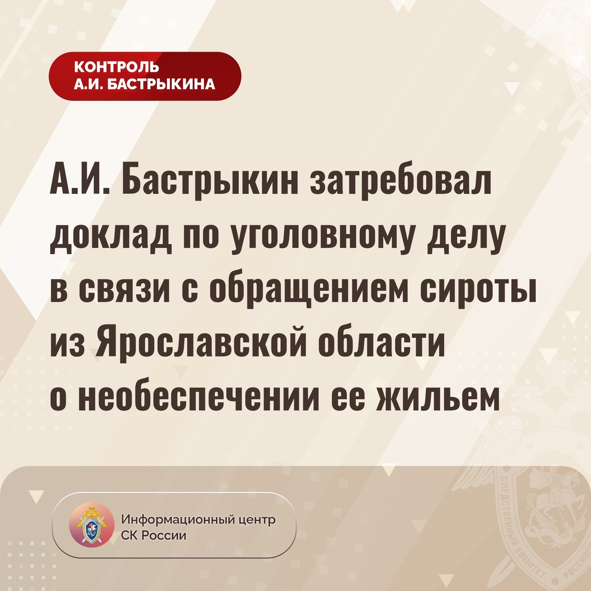 А.И. Бастрыкин затребовал доклад по уголовному делу в связи с обращением сироты из Ярославской области о необеспечении ее жильем