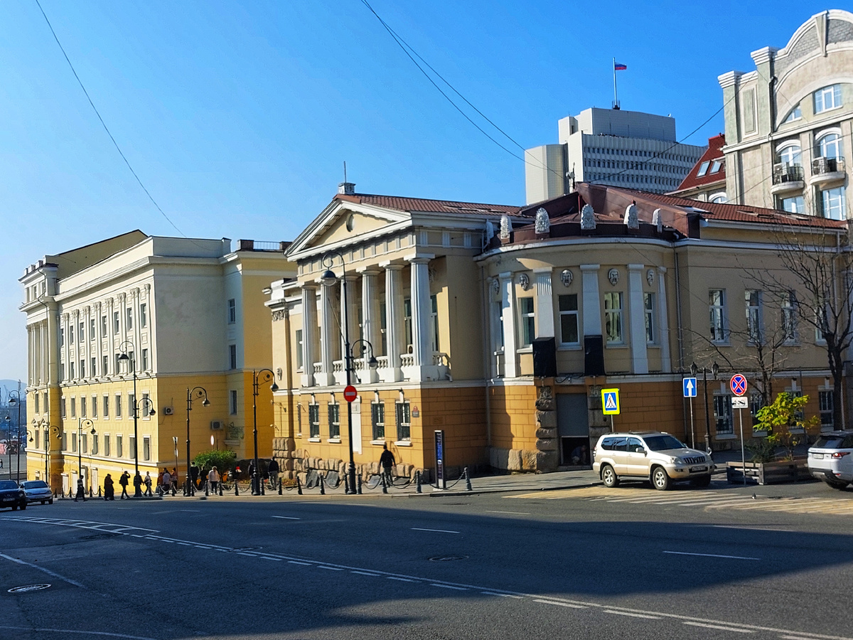 На противоположной стороне Океанского проспекта стоит монументальное здание стиле советского классицизма, построенное в 1939 году. Авторы проекта — архитектор А.С. Муравьёв и художник-архитектор Ю.В. Щуко. Здание проектировалось и строилось как гостиница Дальстроя, которая должна была получить название «Красный Владивосток». Однако гостиница в здании так и не разместилась. Сразу после окончания строительства его передали в распоряжение Тихоокеанского флота, и до 1961 года в нём размещались флотские учреждения.