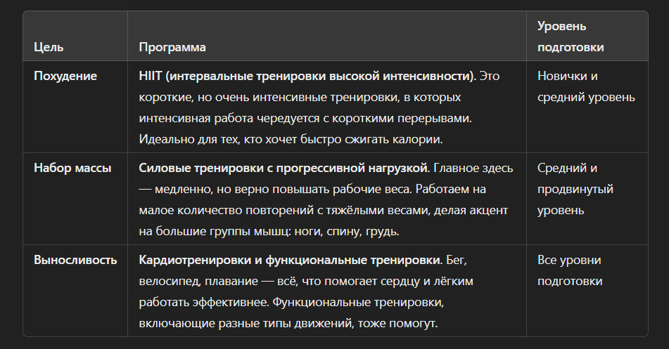 Ты когда-нибудь задумывался, заходя в спортзал, почему столько людей выполняют совершенно разные упражнения? Дело в том, что каждый из них тренируется с разными целями. Кто-то хочет сбросить вес, кто-то — нарастить мышцы, а кто-то — просто улучшить свою выносливость. И хотя тренажёры и упражнения могут казаться одинаковыми, каждый путь в мире фитнеса уникален. Так как же выбрать программу, которая поможет достичь именно ваших целей? В этой статье мы рассмотрим три программы, которые подойдут для разных целей: похудение, набор массы и развитие выносливости. Мы не просто предложим Вам упражнения, но и объясним, как они работают и почему это важно для вашего тела. Цели определяют программу Прежде чем начинать любую тренировку, важно понять, чего ты хочешь достичь. Твои цели помогут определить, на чём стоит делать акцент в тренировках и как строить свои занятия. Вот основные направления и программы, которые помогут тебе достичь результата. Программа для похудения: Интервальные тренировки (