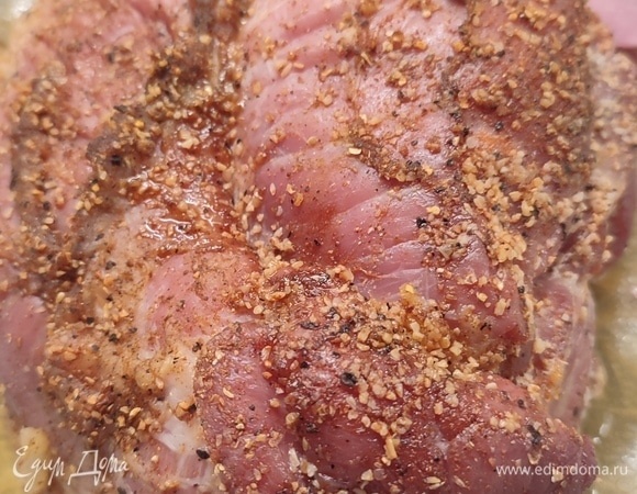 специи - 1по вкусу Смешать соль, обычную и нитритную. Натереть этой смесью мясо. Завернуть его в пищевую пленку и оставить в холодильнике на 4 дня. Через 4 дня смешать любимые специи и натереть ими мясо. Положить свинину в форму для запекания и поставить в духовку. Запекать 3 часа при температуре 100°С. Достать свинину, дать полностью остыть и отправить в холодильник на 8–10 часов.