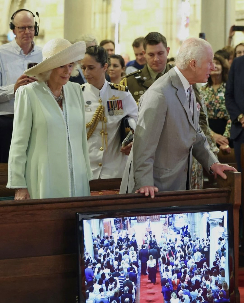 Чтобы хоть как-то оживить сокращенное до минимума пребывание британцев в Австралии, решено было через прессу созвать всех желающих поприветствовать Чарльза с супругой на площали перед церковью Святого Томаса. Зазывали активно, всю неделю. В самой церкви монарх сказал речь и помолился. Меня же удивила Камилла. На ней очень красивая соломенная шляпка, но пляжного, отпускного типа. На официальный визит королеве должно носить шляпку из ткани, или материала в точное попадание по стилю или оттенку и материалу платья. Ее неизменный комплект от Фионы Клэр нам знаком. Как и ее обыденные ожерелья с инициалами внуков, которые не носят вместе с чокером из жемчуга и бриллиантами. Если только ты не зуммер и не предпочитаешь фьюжн. А вот Камилла опять показала, что относится легко к нарушению протокола и я не понимаю, почему никто ей не скажет, что так украшения не носят на официальных мероприятиях. Удивил и сам небрежно подшитый комплект. Как и странные рукава на костюме у Его Величества.