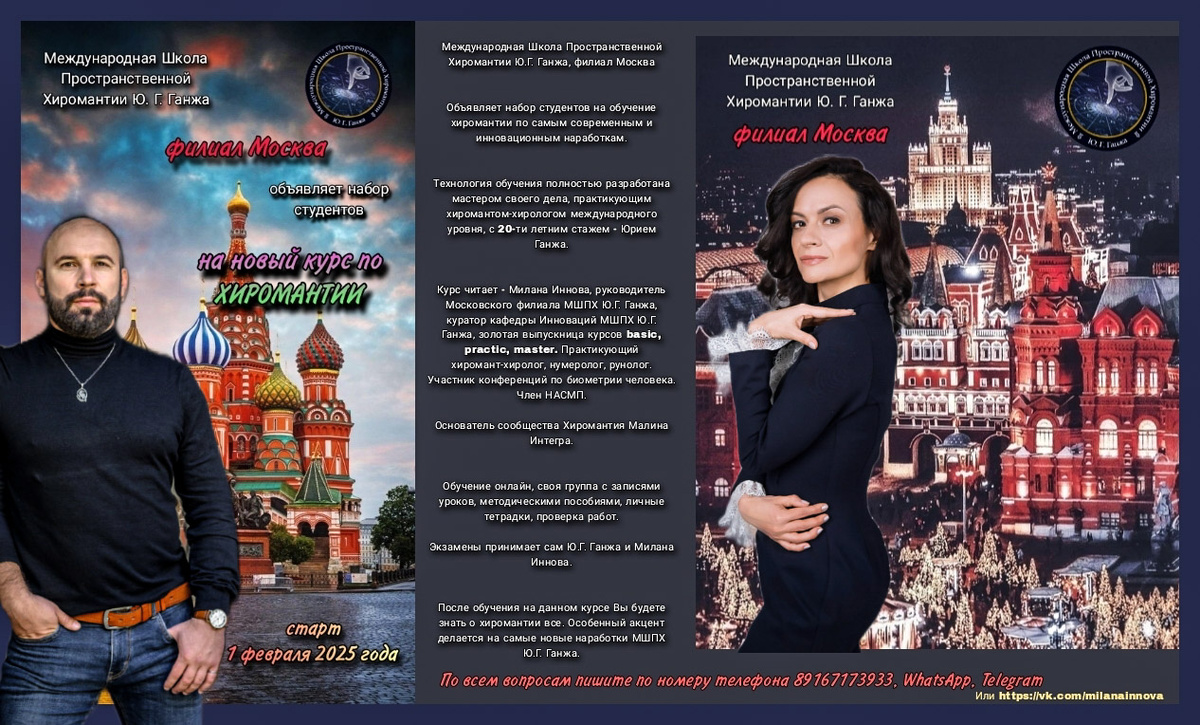 ‼️Международная Школа Пространственной Хиромантии Ю.Г. Ганжа, филиал Москва 💫Объявляет набор студентов на обучение хиромантии по самым современным и инновационным наработкам. 💯☝Технология обучения полностью разработана мастером своего дела, практикующим хиромантом-хирологом международного уровня, с 20-ти летним стажем - Юрием Ганжа.💫💫💫 https://cyclowiki.org/wiki/%D0%AE%D1%80%D0%B8%D0%B9_%D0%93%D0%B0%D0%BD%D0%B6%D0%B0#:~:text=%D0%AE%D1%80%D0%B8%D0%B9%20%D0%93%D0%B0%D0%BD%D0%B6%D0%B0%20(%D1%80%D0%BE%D0%B4.,)%2C%20%D1%81%D0%BF%D0%B5%D1%86%D0%B8%D0%B0%D0%BB%D0%B8%D1%81%D1%82%20%D0%BF%D0%BE%20%D0%BC%D0%B5%D1%82%D0%B0%D1%84%D0%B8%D0%B7%D0%B8%D1%87%D0%B5%D1%81%D0%BA%D0%B8%D0%BC%20%D0%BF%D1%80%D0%B0%D0%BA%D1%82%D0%B8%D0%BA%D0%B0%D0%BC. ☝Курс читает - Милана Иннова, руководитель Московского филиала МШПХ Ю.Г. Ганжа, куратор кафедры Инноваций МШПХ Ю.Г. Ганжа, золотая выпускница курсов basic, practic, master. Практикующий хиромант-хиролог, нумеролог, рунолог. Участник конференций по биомет