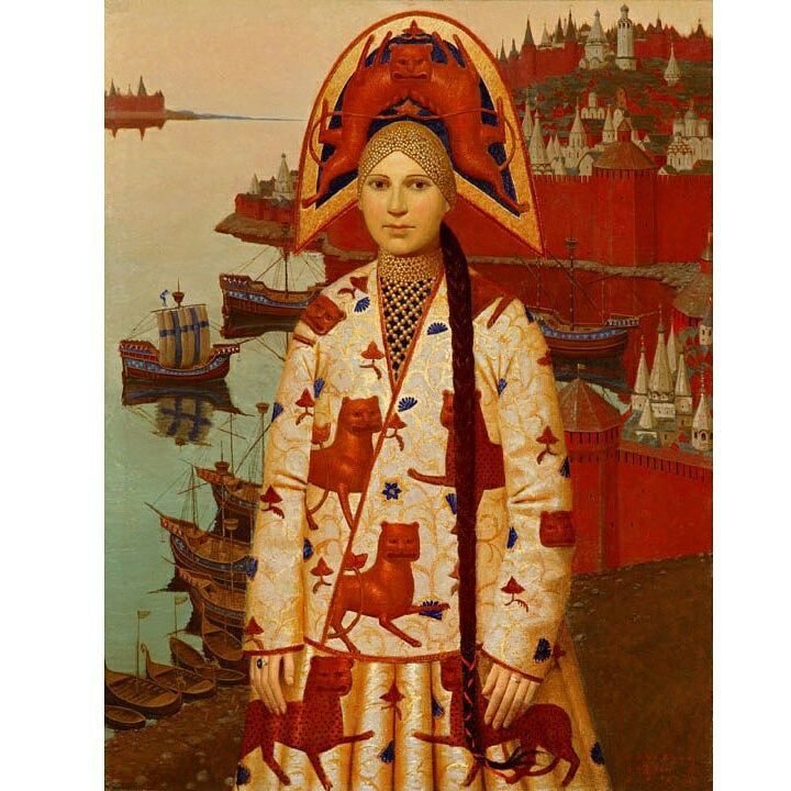 Картины Андрея Ремнёва непостижимым образом сочетают приемы русской живописи 18 века и современные черты, но больше всего отсылают нас к древнерусской иконописи. И это не удивительно, ведь художник был иконописцем в Спасо-Андрониковом монастыре в Москве, и именно там сформировался его неповторимый стиль. Большинство картин в подборке созданы в последнее десятилетие. Это зрелое искусство, вобравшее в себя многолетний опыт художника. Строгие, спокойные лица, симметрия, локальность цветов. Все это свойственно иконописии, и ярко проявилось в творчества Ремнёва. Но больше всего поражает передача тканей, серебряных и золотых, и исходящее от картин свечение. Это взрыв креативности и виртуозности. Его женщины прекрасны и величавы. И почти все – с косами до пояса. Помимо всего, в своих картинах художник уделяет значительное внимание одежде персонажей. «Одежда – это не второстепенная деталь, я ищу связи между главными характерами и декоративными возможностями элементов одежды. Эта взаи