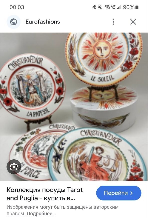 На днях я листала Pinterest (сайт/приложение для поиска изображений), и в рекомендациях мне выпала посуда от Dior на тему Таро. Так как уже было поздно, то я просто загуглила про неё и сделала вот такой скрин, чтобы не забыть и вернуться к этому: Да, это далеко не новая коллекция, и, думаю, в определённых кругах её не обсудил только ленивый, но мне она попалась только сейчас. Многие, наверное, в курсе, что основатель модного дома Кристиан Диор был человеком, склонным верить в астрологию, в Таро, нумерологию. Он носил различные амулеты, прислушивался к знакам и приметам. Конечно же, такой склад личности не мог не отразиться на его творчестве. И вот: одно из творений его бренда – посуда с тематикой Таро. Это ручная роспись, костяной фарфор. Вскользь глянула – оказывается, такое можно приобрести и на маркет-плейсах, и на сайтах купли-продажи. Правда, оригинал ли это или нет – неизвестно. Давайте просто полюбуемся. Кстати, вот здесь мне видится отсылка к мастям Таро или стихиям, представля