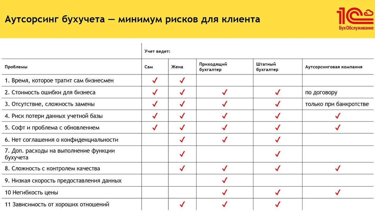 Аутсорсинговые компании часто предоставляют услуги по оптимизации налогов, что может значительно снизить налоговую нагрузку на бизнес. Наша компания "1С:БухОбслуживание. Родина и партнёры" имеет практический опыт работы в этой области и может предложить законные способы сократить расходы на налоги, что неопровержимо является большим плюсом по сравнению с внутренним учетом, которому зачастую не хватает времени на анализ изменений в налоговом законодательстве.
