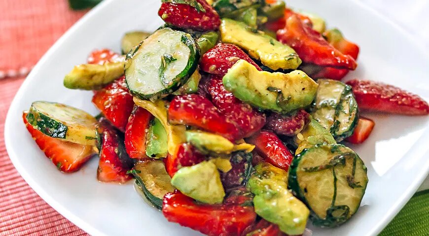 Уберите плодоножки у клубники и нарежьте ягоды на 2–6 частей, в зависимости от их размера. Огурцы нарежьте кружочками. Снимите листочки мяты с веточки, сложите их друг на друга, сверните в рулетик и нарежьте тонкими полосками. Авокадо очистите от кожуры и косточки, нарежьте аккуратными дольками. Смешайте масло с уксусом, добавьте соль и перец. В миске соедините все ингредиенты, заправьте смесью и подавайте сразу. Если Вам понравился рецепт, ставьте лайки, подписывайтесь на нас.